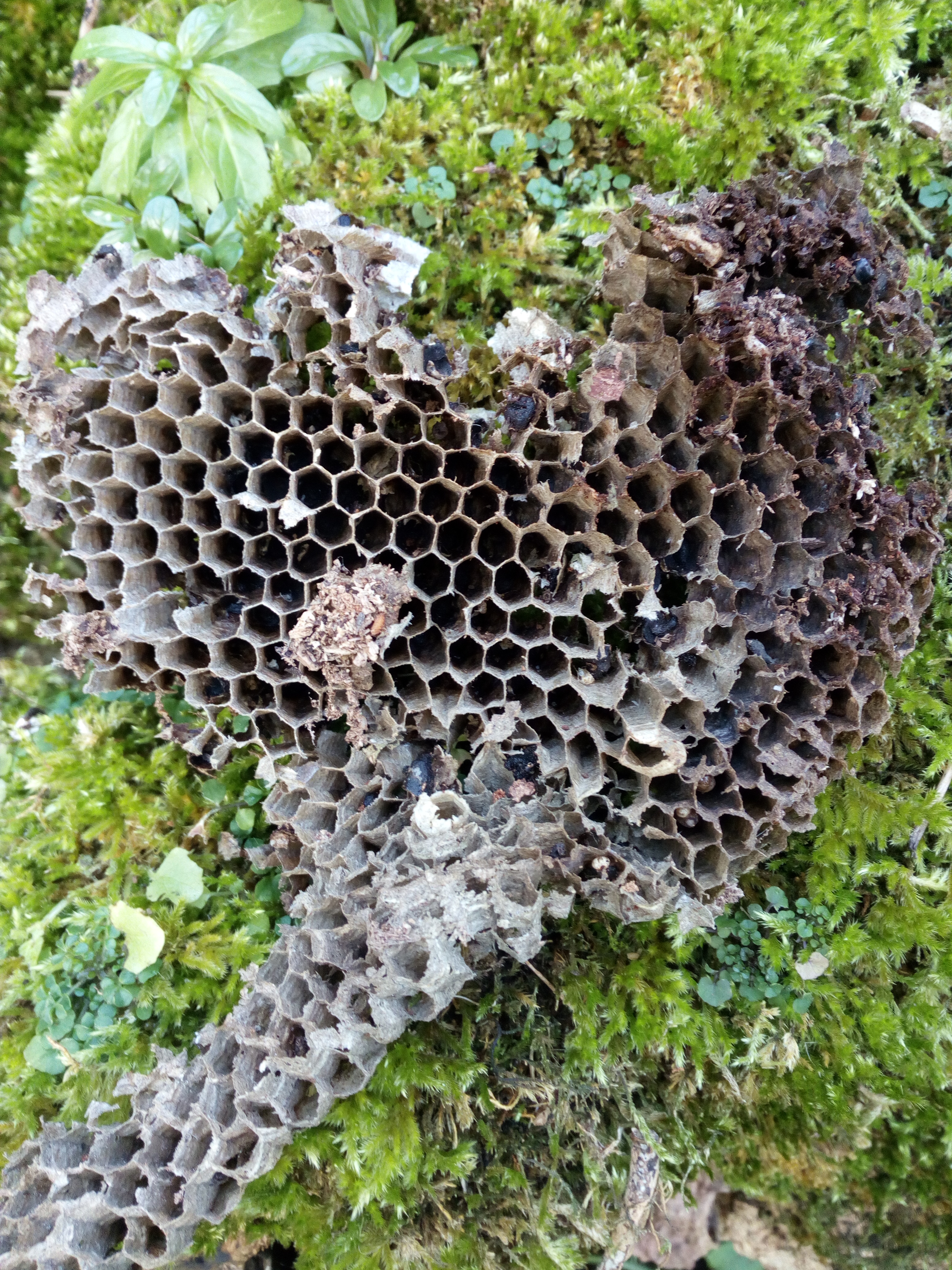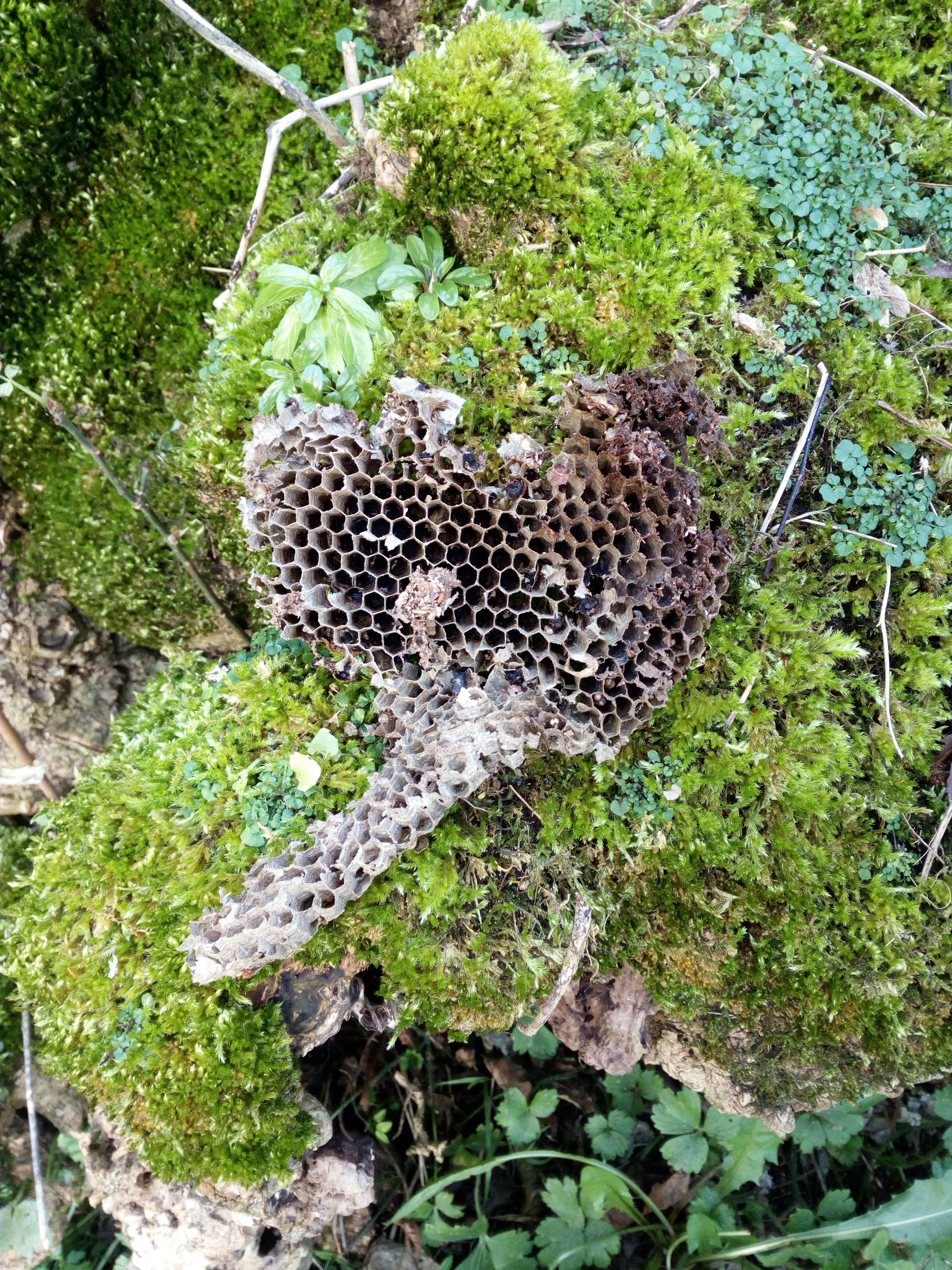 In this article, we take a look at one of the insects that can be found at Ballyeglish Old Graveyard. Below are photos of a comb belonging to a species of wasp that had lived for a time in an old tree stump at the site. Known as “paper wasps,” the common yellow jackets (vespula vulgaris/germanica) chew plant fibres to create a papery material which they use to construct these elaborate incubators for their young.