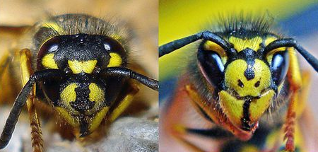 The Common wasp, vulgaris, is slightly smaller than germanica. Both will sting, but the German variety is said to be more aggressive. They can be told apart by the stripe on their “snout.” The photos below show the difference, with the Common wasp having a thicker black line down towards its “mouth.” There is also a difference in their markings as the next images below demonstrate. Looking at the torso markings might be easier than trying to get a scally at their faces, as they might not always appreciate you being just that close to them.