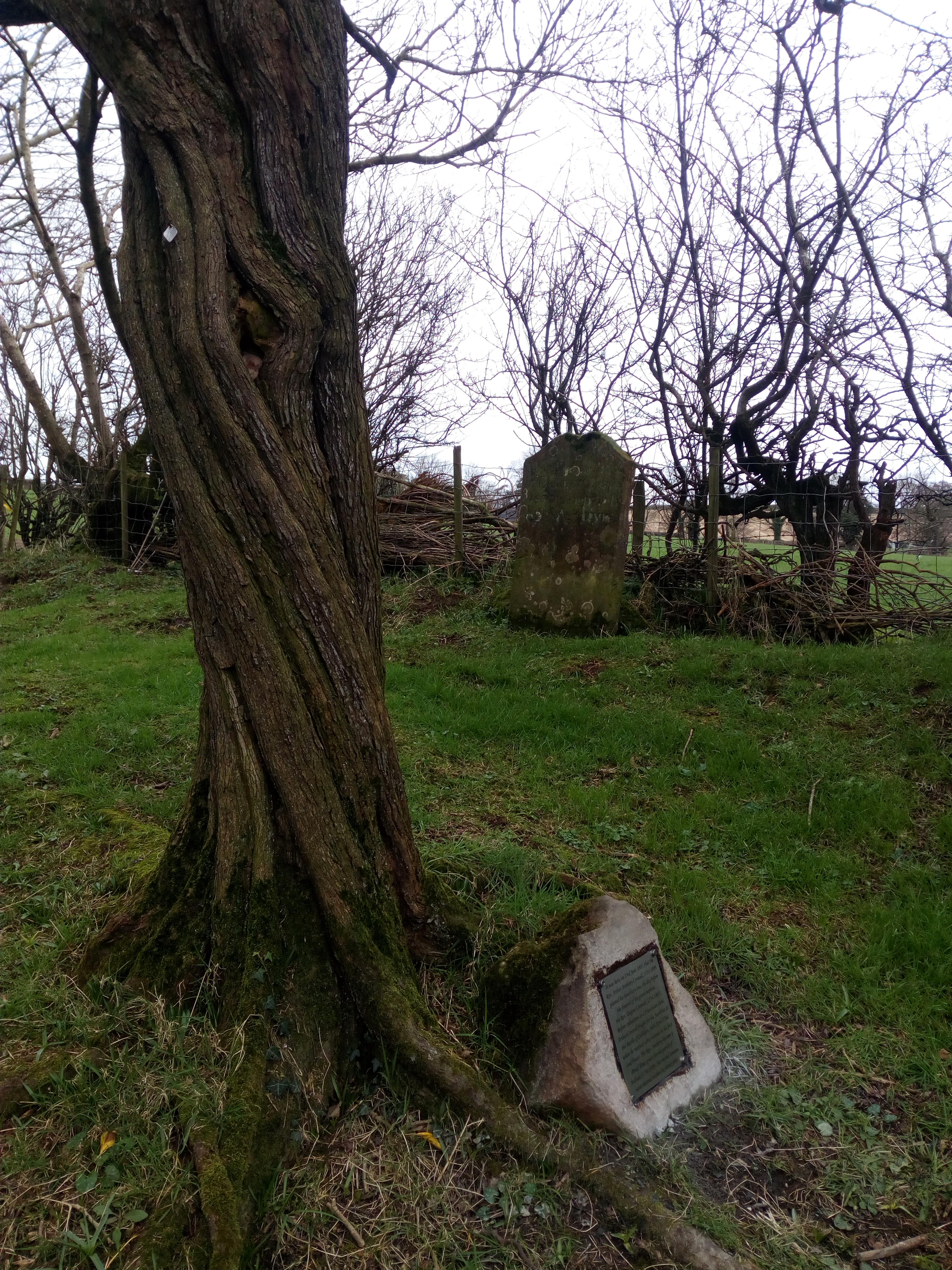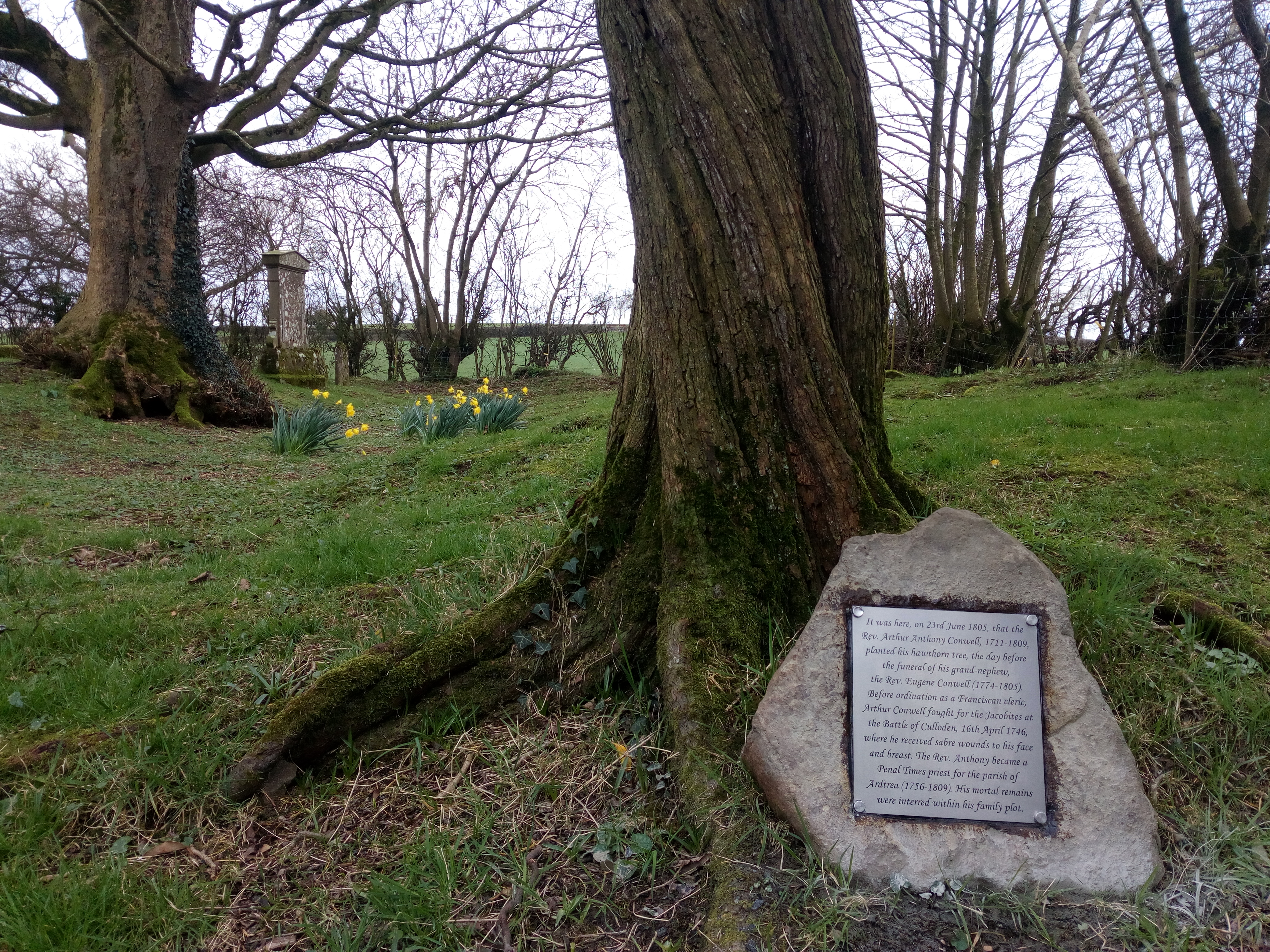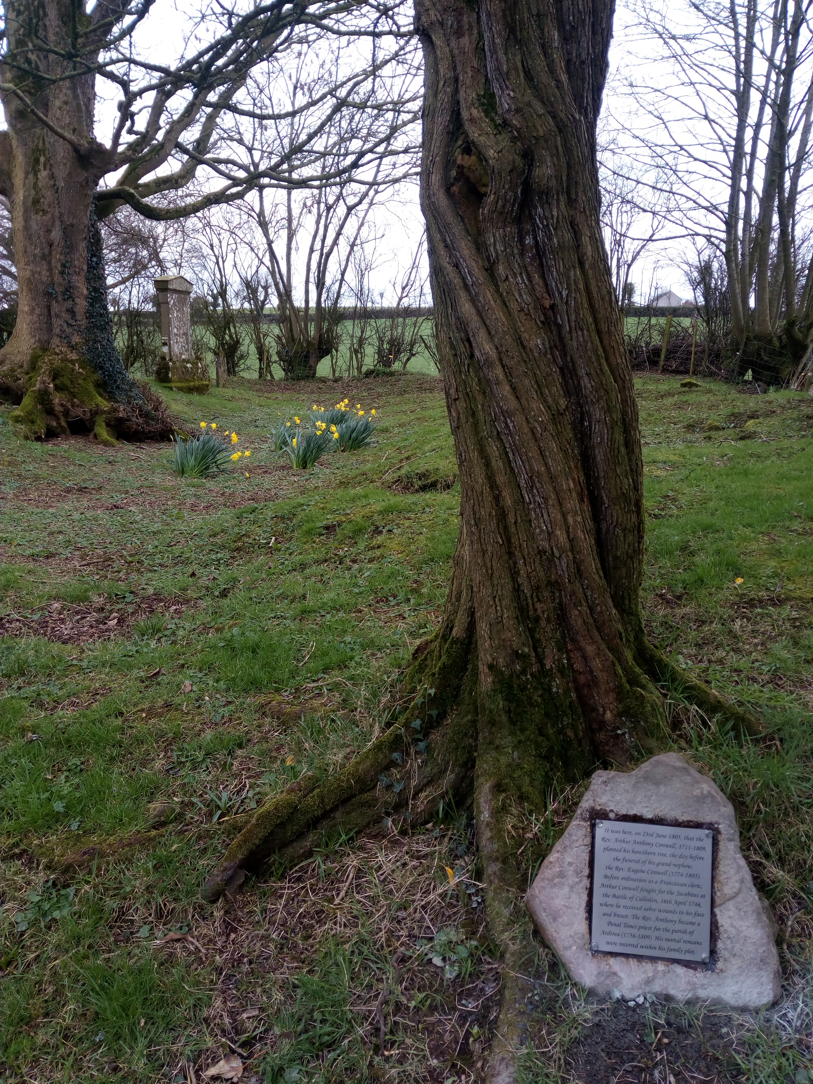 Due to the discovery of an inscription found on the previously buried edge of a grave slab within the Cowell enclosure, the anomalous hawthorn was found to have been placed there the day prior to the funeral of the Rev. Eugene Conwell, grand-nephew of the Rev. Anthony.