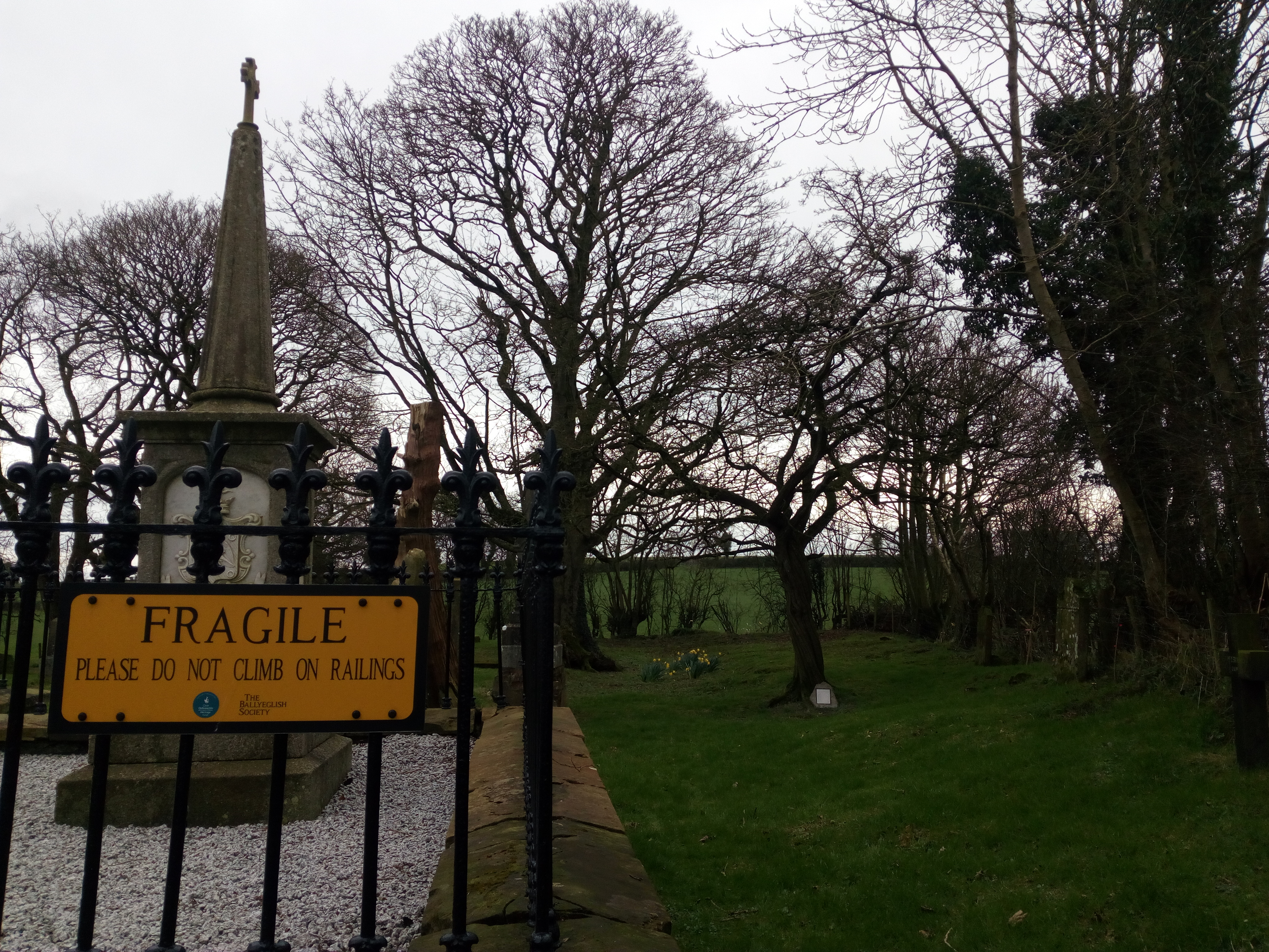 Whoever did the actual digging, the tree has survived for 219 years, raising many questions throughout that time as to why it was there at all. The Ballyeglish Society is hopeful that the new stainless steel plaque, recessed into a piece of local basalt found close by, and positioned at the base of the hawthorn, will answer those questions for visitors. It’s also just one more feature for those who dander through Ballyeglish Old Graveyard to have themselves photographed beside.