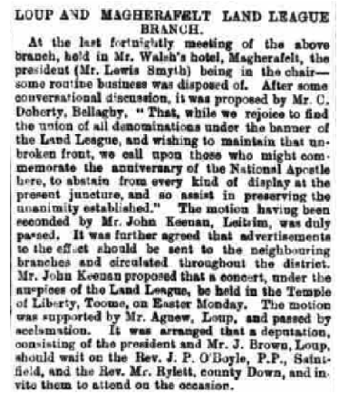 This article is taken from the Derry Journal of Wednesday, March 16th 1881. The Land League was officially set up in October 1879 at the Imperial Hotel, Castlebar, Co. Mayo. It’s aims were to create and protect tenant’s rights, including the right to buy the land they worked. It sought to end landlordism, and attracted support from across the religious divide. One of the first conferences was in Belfast, and was organised by The Route Tenants Defence Association of Ballymoney. Ulster Presbyterians were at the forefront of the fight for tenants’ rights. The Land League of the Loup and Magherafelt was founded on 4th December 1880.