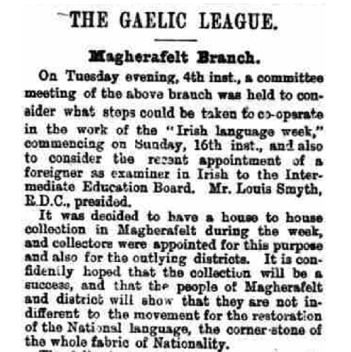 This brief article was taken from the Irish News of Tuesday March 11th, 1902. We can see from this how Louis Smyth, then in his fifties, was to the fore of progressing Gaelic culture in the south Derry area. The Gaelic League, more properly known as Conradh na Gaeilge, was founded in 1893 by Douglas Hyde, a protestant nationalist. It is still going strong today. It seems that the indefatigable Louis Smyth was a member from it’s earliest days. R.D.C. after Smyth’s name refers to Rural District Councillor, an elected position from 1899 on.