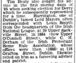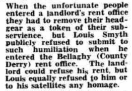 Smyth was a stalwart when it came to the rights of tenants of the land. He is mentioned in William O’Brien’s (politician and social revolutionary) famous “Recollections,” and carried his unshakeable convictions everywhere he went, wielding them against those he felt were guilty of abuse of the people. The adjacent clip is taken from a Derry Journal article of 16th April 1954. It describes Smyth’s approach to landlords.