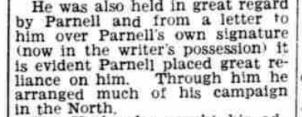 In April 1887, when Smyth was in his forties, a meeting of Nationalists was held on a Tuesday in the market square, Maghera, to protest against the new Crime Bill. A Mr R.D. Pinkerton of Ballymoney was chairman of proceedings. Notable figures in attendance included 4 Catholic priests, as well as Bernard Rogers, D.C. Gillespie of Coleraine, and Louis Smyth, who “moved a series of resolutions,” all of which received the approval of the assemblage. By this stage in his life Smyth was a person of serious influence. We must presume that his position was gained through much noted activism prior to this event, even if not all was recorded or has yet been discovered.