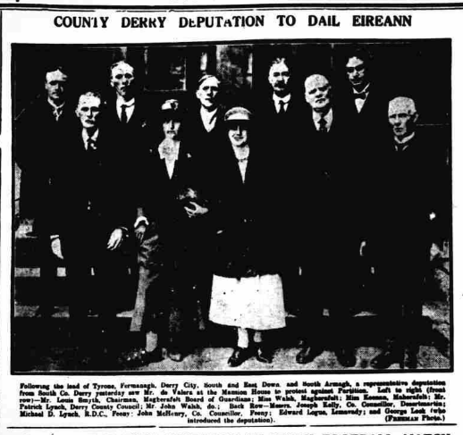 The following photo documents the delegation from County Derry who visited Dublin in September 1921, to register their protest at the partition of Ireland, which was enacted in May of that year. The group met with de Valera, then in opposition to the nascent jurisdictional development. It is worth noting that the delegation choose to meet with the eventual leader of the anti-Treaty side. De Valera was known to be a staunch opponent of the Government of Ireland Act 1920. Nationalists and Republicans, from the six north-eastern counties contained within the new state-let, were understandably distraught at the new political arrangements. We can only imagine how distressed someone like Louis Smyth would have been, to have seen his life’s work of political activism founder upon what was a de facto Orange Order-run state-let, with the subsequent oppression Smyth knew it would bring to his community. We must also consider the possible impact that the many irate delegations from the north would have had upon the decision making of de Valera. Civil War was to break out less than one year after the visit from the Derry delegation, with Republicans from Smyth’s home parish to the fore in fighting the British forces ranged against them, as well as confronting the newly created Free State Army, a proxy force armed and assisted by their former foes in the British Army and Royal Navy. Smyth’s 1921 visit to his nation’s capital, and parliament, took place only a few years before his death.