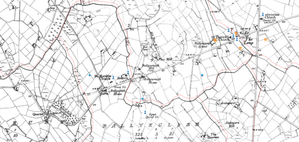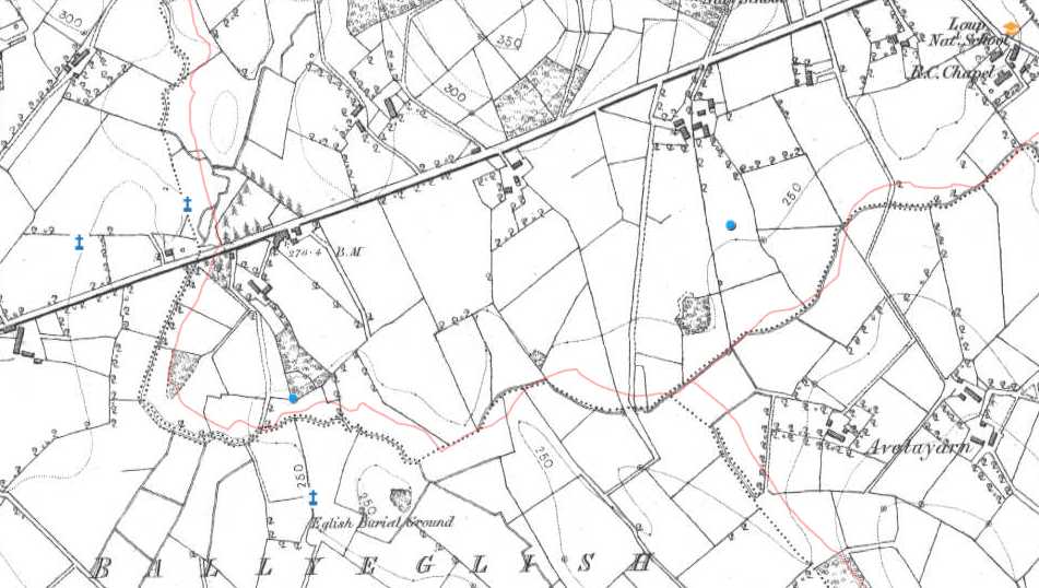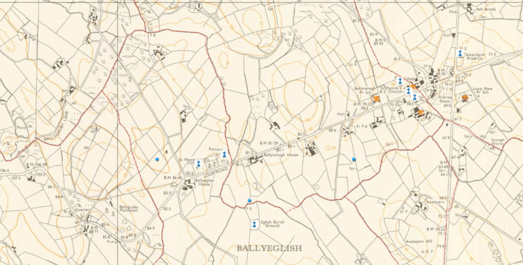 Those familiar with the area might notice the location of both the Catholic Church and National school in the top right corner of the map. This is the location of the 1771 church erected by Rev. Anthony Conwell, buried at Ballyeglish Old Graveyard. Penal Laws, still in place at that time, meant that Catholic places of worship (known officially as “mass houses” as the term “church” was reserved for the Anglican denomination) were not permitted to be built alongside main roads. The current Catholic Church was built close by, in 1864, along the northern side of the B18 road, and its adjoining graveyard was used from that time, although the “Old Graveyard” at Ballyeglish was still in use into the latter decades of the 20th Century for both Catholic and Protestant burials.