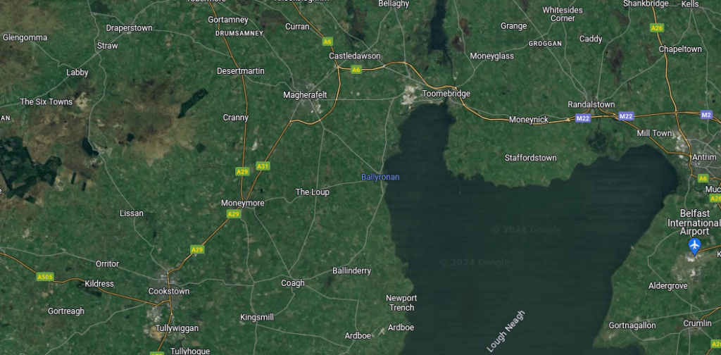 Ballyeglish Old Graveyard is located in County Derry in north-eastern Ireland, close to the village of The Loup which is to the west of Lough Neagh, the largest lake in The Celtic Isles. The site lies south of the B18 road which itself runs between the villages of The Loup and Moneymore.